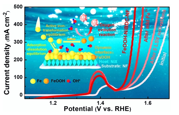 构建稳定的铁基析氧微观催化界面是非均相催化水分解制氢的关键步骤。然而,实际工业应用中,对微观析氧界面的定向、动态调控是一个很大挑战。基于此,团队发现同时利用界面的FeOOH转化平衡和Fe*吸附-溶解平衡可以有效实现析氧催化界面的动态更新和精准调控。可以通过平衡反应的定量属性,改变碱性电解质中Fe3+浓度来实现精准调控。最终,利用原位电化学活化和催化平衡的定向调控,合成了高活性、长期稳定、具有工业应用潜力的FeOOH-Ni基析氧催化剂。