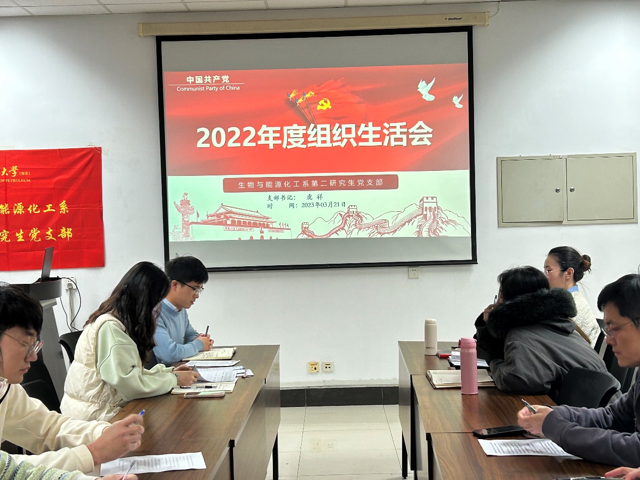 2023年3月21日晚19点,生物与能源化工系第二研究生党支部于逸夫楼340召开2022年度组织生活会和民主评议党员会议,党支部书记虎祥及全体党员参加此次会议,大会应到党员29名,实到党员26名。