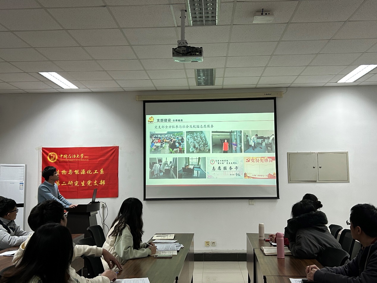 最后,虎祥同志总结道,支部高质量发展的背后,是各位党员同志的大力支持和辛勤付出,只有把各位同志拧成一股绳,才能成一个战斗堡垒。希望各位同志不忘初心、牢记使命,瞄准前沿努力科研,模范带头服务群众,珍惜在学校的时间和机会,充分利用好石油大学和党支部的平台,对标问题全面发展,为把支部建设成一流支部,把自己建设成为一流人才而不懈努力。