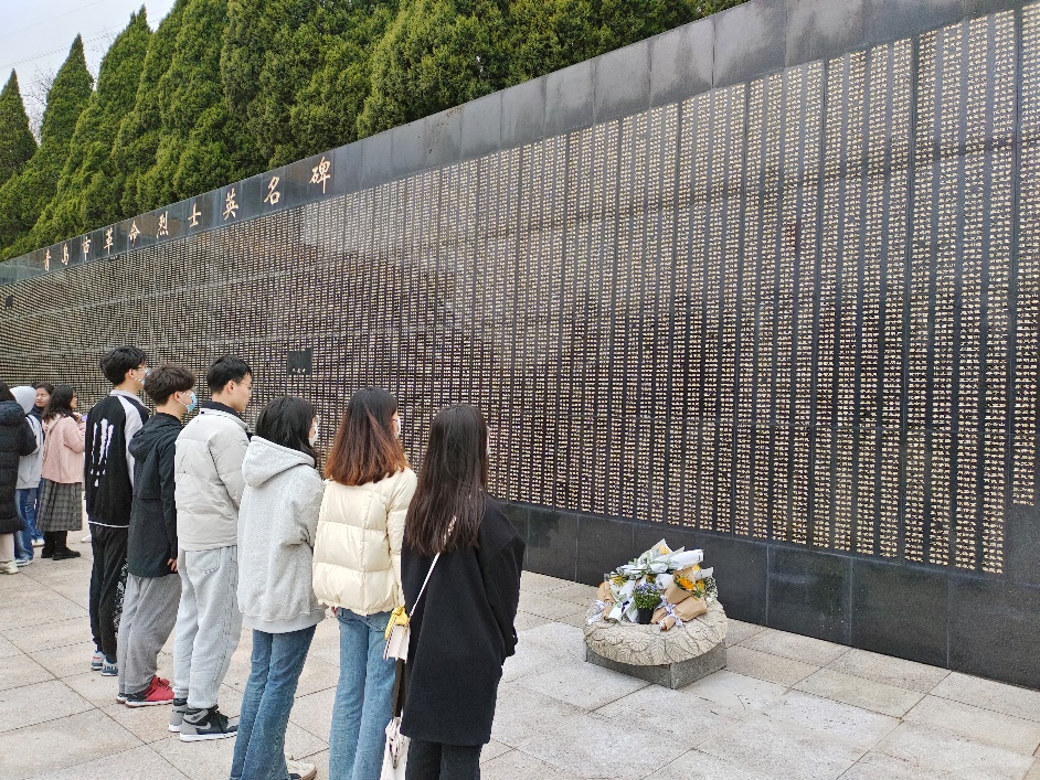 对抗战馆和军魂馆有一定的了解后,党支部一行人来到革命烈士英名碑前献花。“革命烈士英名碑上的名字密密麻麻,但仍有许多先烈未能留下自己的姓名。无数英雄为了民族独立、人民幸福,前赴后继、矢志不渝。穿越岁月沧桑,他们的名字以及他们的精神如同明灯,照亮后人前行的道路。作为一名学生党员,我也会尽自己的努力为国家和社会做出贡献,让先烈对这片土地的热爱薪火相传。”参与本次活动的能源化学工程2019级1班马明杭说到。最后,全体成员在“山河魂”烈士群雕下合影留念。