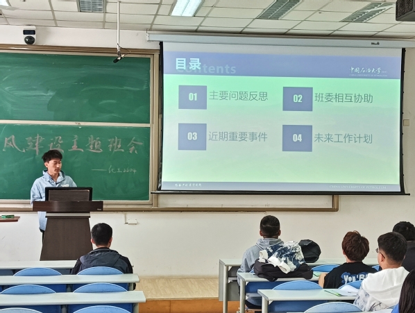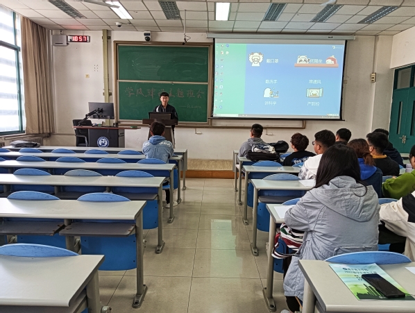 此次班会分为四部分。首先,学习委员贺鹏就班级体基本情况和班级学风问题进行汇报,涉及早晚自习、旷课早退、消极懈怠、自制力差等方面,提出方法与努力结合的学习思路,并根据大一上学期的期末成绩针对性地制定了帮扶计划和背单词计划。其次,班长孙新懂就班级建设进行发言,谈及了学习小组、班干部、团建等方面存在的问题,尤其注重班委交流较少、工作欠缺的问题,指出班干部要认真负责、加大交流力度和做好带头作用。此外,孙新懂罗列了近期的重要事件,还提出了定期召开班委会、全班同学资源共享、经营好班公众号和抖音号的未来工作计划,对未来班级体以及个人的行动具有指代意义。随后,班主任付建冶老师就自己的经验提出了建议,并就就业和读研两个方面各指出了努力的方向。就班级问题,班主任提出要关注运动会和团建等班级活动,增强班级凝聚力;就学习问题,鼓励大家多参与竞赛和科研项目,在大一大二时多接触大创,走进实验室,并加强专业英语词汇的学习和增强口语。此外,付老师关注同学们的心理问题,引导同学们以积极乐观的心态学习进步。最后,由辅导员国浩点评班级学风并作出指导。国浩对学生成长手册作了简单介绍和使用方法,指出了手册的重要性,并对日常的学习生活作出了规范。