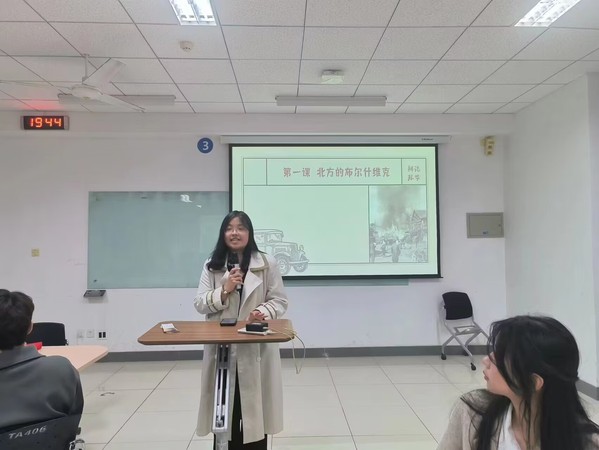 室内部分于4月16日晚在综合实验楼A座402举行,并邀请2022级辅导员国浩、化工2004国云飛、化工2005崔一凡和俄语2201隋欣月参加。活动采取情景带入的方式,将时钟拨回民国三十年,一组成员一个角色,带入一段发生在开往苏俄的一趟列车上的历史旧事,带领大家体会动荡年代里的杀伐与守护、克制的爱与肆意的恨,谨此缅怀先烈,牢记先辈们的付出。化工2204团支书王思涵带领大家回顾历史,向为争取和平而英勇牺牲的先烈们默哀三分钟。营销2201团支书王佳倩带领各支部成员开始列车课堂。有俄语教学、自由辩论等,两方阵营展开了激烈的辩论。就“世界读书日”的主题,还开展了文学赏析课,支部成员就自己喜欢的名人名言结合自身经历发表理解和看法。活动中还增加了刺激的“解谜拆弹环节”,虽然大家解开了谜题,但是炸弹依然爆炸。是日本人在列车上安装了假炸弹,而身为“汉奸”——真实身份是地下情报人员——的金菱发现并以身犯险为大家丢出了炸弹,自己却英勇牺牲。最后放出故事背景视频,让大家看到身为地下情报人员的“汉奸”为国家的胜利承受的压力和谩骂。