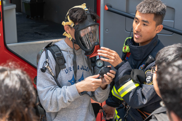 演练以国重楼楼内工作室起火为背景,着火后,楼内消防报警设备发出报警信号,消防值班员接警后立刻上报火情并启动应急疏散预案。演练开始,烟雾弹释放,警报拉响,全体师生迅速做出反应,按照指定的安全出口和疏散路线,俯身用湿毛巾捂住口鼻,快速安全有序的撤离至国重楼南门广场,用时约2分钟。随后,消防大队进行灭火演练,师生代表现场进行了灭火器的实景操作,并了解了消防员防护装置的穿戴方式以及消防车的内部构造和使用原理。学院研究生辅导员郭孟对同学们的本次演练给予了充分肯定,他提到,同学们坚持疏散逃生基本原则,在疏散过程中保持了安全良好的秩序和较快的反应能力,并强调了预防火灾与逃生演习的重要性,同时希望同学们关注消防,学习消防,顾全大局,救助结合,提高安全责任意识和遇险自救能力。