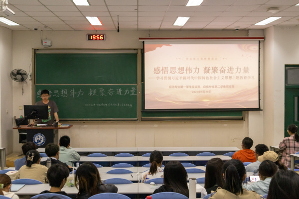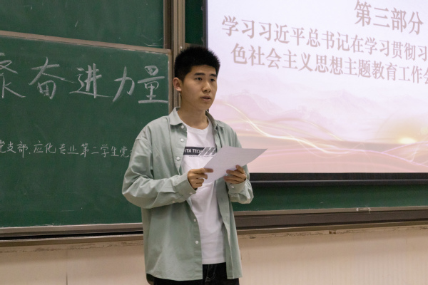 为深入学习贯彻习近平新时代中国特色社会主义思想主题教育,强化理论武装,理论学习往深里走、往实里走、往心里走,5月18日,应化专业第一、第二学生党支部联合开展“感悟思想伟力,凝聚奋进力量”主题教育活动。活动由应化专业第一学生党支部书记孙正洋主持,应化专业第一、第二学生党支部党员、发展对象和入党积极分子参加。