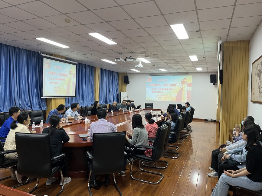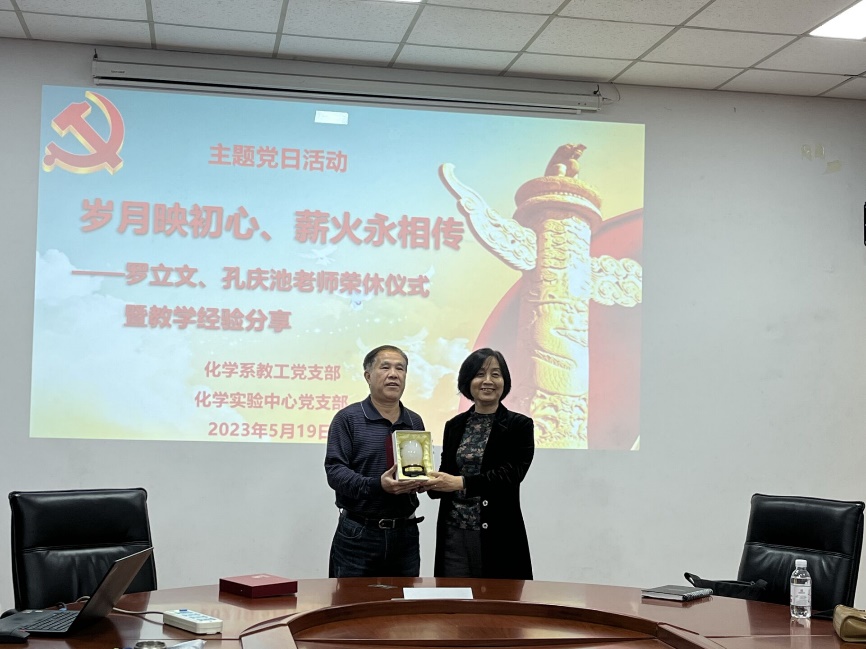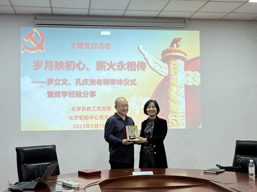 岁月映初心,薪火永相传。5月19日下午,化学系和化学实验中心党支部在工科A121会议室举行主题党日活动,为罗立文和孔庆池两位老师举行荣休仪式,并进行了教学经验分享。院长刘欣梅、党委书记张永宁、副院长曾景斌应邀出席了仪式,活动由化学系党支部书记卢玉坤主持。