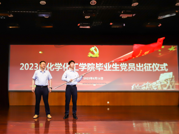 张永宁为2023届毕业生党员青年先锋队授旗,旗面上“化育初心 工致报国”八个字是学校学院对青年学生的期许和鼓励,希望石大化院人能在新的院校或岗位上,学先锋、做先锋,开拓奋进、再谱新篇。授旗仪式后,全体党员高举右拳,庄严宣誓:“愿以吾辈之青春,复兴伟大之中华!奋斗正青春,青春献给党!请党放心,强国有我!”