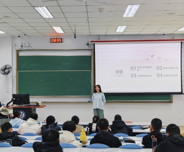 班会伊始,杨思微首先介绍了班级制定的早自习考勤制度。她指出,早自习不仅是一个良好的学习习惯,更有著于培养同学们的时间管理能力和自律精神。在早自习制度的推动下,化学2302班全体成员可以在未来的学习和工作中取得更大的成功。随后杨思微规划并讲述了化学2302班级发展方向。在充分征求全体学生的意见和确保发展方向符合班级实际情况的条件下,班委会共同商议出班级发展方向。化学2302团支书亓佳艺表示:“在发展方向的指引下,同学们一定会积极参与到班级建设中来。”接着,杨思微强调了近期考试时间的安排,并指出每位同学都应该以积极的态度去迎接考试。她鼓励同学们要坚定信心,紧跟学校教学安排的同时自主发展个人兴趣爱好,做到第一课堂和第二课堂兼顾。她还提醒大家要注重提高课堂听课效率。只有专注在课堂的每一秒,才能在考试中取得优异成绩。班会最后,杨思微再次强调了班级发展需要每一位成员参与,她提出,“班级发展不仅仅是班级的事务,更关系到每个成员的个人发展成长。”