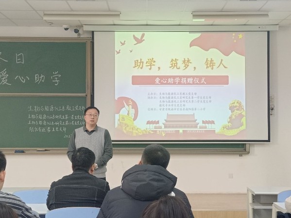 2023年12月29日,生物与能源化工系教工党支部、生物与能源化工系研究生第一学生党支部、生物与能源化工系研究生第二学生党支部、能化专业学生党支部于南教210联合举办2023“情暖冬日爱心助学”活动,将这份持续三年的爱心继续传递给甘肃省陇南市宕昌县南阳镇第二小学的留守儿童和贫困学生,帮助贫困孩子成长成才。