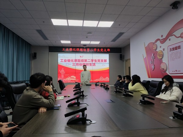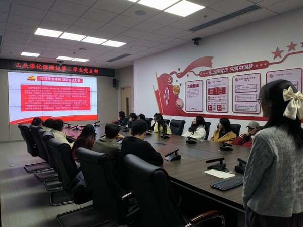 为深入学习贯彻全国两会精神,引导支部党员强化理论修养,坚定理想信念,2024年3月14日晚19点到21点,工业催化课题组第二学生党支部全体党员和积极分子于国重楼B219会议室深入学习全国两会精神。