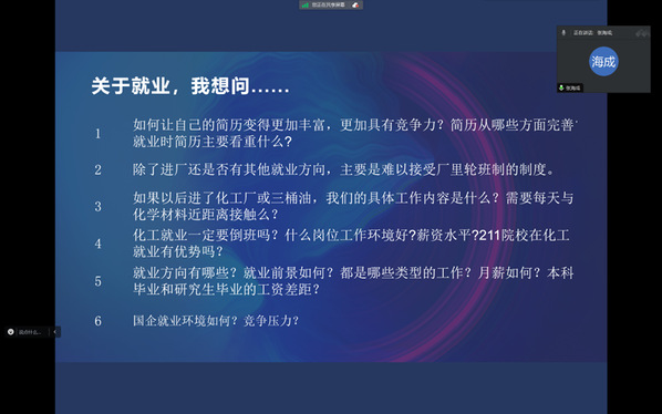 在活动开始前一周,张梦宇向能源化学工程专业的所有同学收集了有关就业的问题。张梦宇将问题整合分为就业方向、就业环境、工作待遇、工作内容以及发展前景五类,把对问题的解答作为本次活动的主体部分。