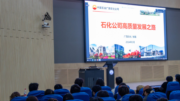 “希望大家将来可以加入广西石化公司,和我们一起怀抱梦想,善作善从,敢作敢为。也欢迎大家有时间来广西石化看一看。”在最后,张磊向学生们发起了真挚的邀请,邀请大家前去广西石化参观学习,了解更多关于石化工艺流程的知识,也邀请学生们将来加入广西石化,与他们并肩作战。张磊以石化公司高质量发展之路为主题的分享给每个化院学子上了一堂别开生面,生动形象的生涯规划课,加深了学生们对于石化行业的了解,为学生未来就业提供了一个清晰的方向。