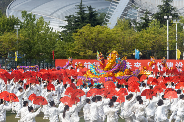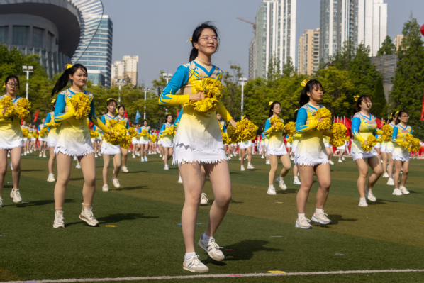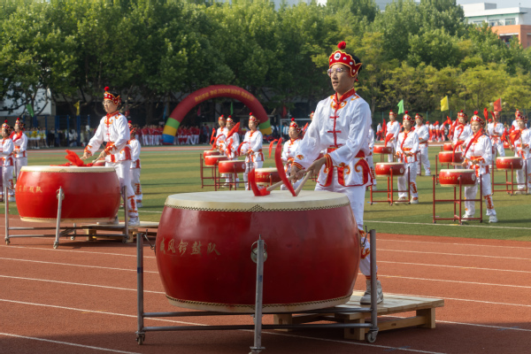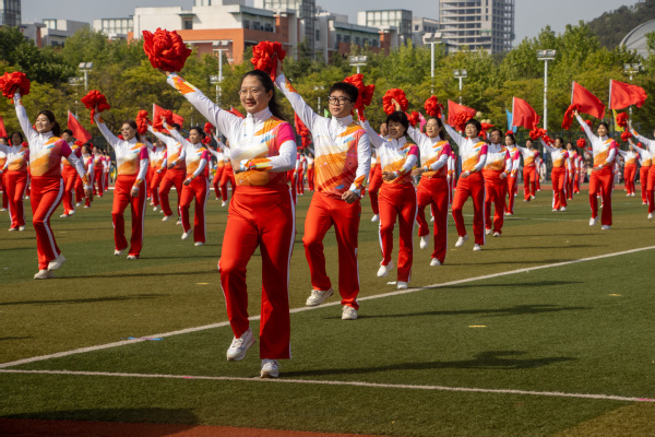 运动场上摩拳擦掌,观众席里掌声雷动。团体操威风锣鼓、太极扇、啦啦操和教工排舞依次上演,引起全场观众欢呼。威风锣鼓整齐划一,鼓声震耳欲聋,尽显豪气壮志;舞动的神龙引领着太极扇方队的入场,白衣簇拥着盘龙,潇洒展扇,最后排出的“龙”字体现着传统文化在我校活力不断;随后入场的啦啦操排出各个重要的时间节点,金色的数字映照阳光,尽情释放着青春活力;最后红旗簇拥着教职工舞蹈,吉祥物们穿过操场领舞,红色的丝带伴随歌声体现着职工们一心向党的赤诚之心。