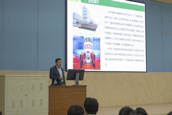 会上,首先由刘东介绍学院举办此次“化蕴大讲堂”的意义及本次主讲人刘季善,全体学生对校友刘季善的到来表示热烈欢迎。刘季善向参会人员带来以“仰望星空、脚踏实地、走好人生每一步“为主题的讲座,他首先对山东万得福实业集团进行了详细的介绍,他讲到山东万得福实业集团有限公司是由一家年销售收入几百万元的小厂,发展成为年销售收入超20亿元的国家级农业产业化重点龙头企业和国家级高新技术企业,是国内大豆蛋白行业内产业链最长、产品品类最多,加工深度最深的企业之一。