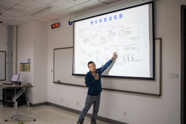 活动伊始,魏雯晓指出此次“企业导师进课堂”对于学生而言的意义所在,并介绍了主讲人曹传洋、刘良群。曹传洋作为第一位主讲人,用宣传短片向在场学生介绍抚顺石化企业的工作地点、生产装置与运行体系。然后,他通过详细的生产装置图着重讲解重油催化裂化概况及工艺原理,他讲到此工艺是是在催化剂的作用下,选择适当的操作条件以吻合正碳离子的单离子与双分子两部分反应从而生成气体、汽油等产物;紧接着介绍了烟机能量回收、余热炉、烟气脱硝、烟气脱硫、产品精制等八大原理。最后他希望化院的学生能够掌握扎实的基本功,在未来工作中可以将知识灵活运用。刘良群作为第二位主讲人以洗衣液在生活中广泛应用为例引出他所分享的内容:洗化厂磺化工艺装置工艺。他讲到抚顺石化关于这方面在市场中广泛应用;他通过流程图详细讲解了磺化这一过程所需的原材料与其以熔硫和干燥的空气燃烧,在有机物中发生一系列反应的工艺原理。