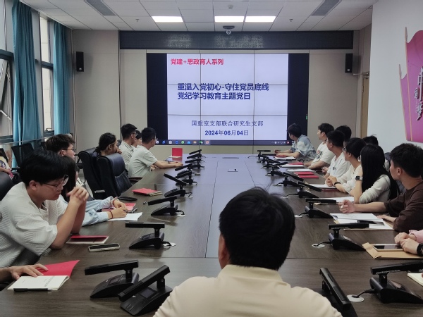 2024年6月4日下午,重质油全国重点实验室党支部和化工研究生第三学生党支部关于“重温入党初心-守住党员底线党纪学习教育”主题党日联合党建活动在古镇口校区国重楼B217党建活动室顺利举行。参与本次活动人员有重质油全国重点实验室支部副书记朱丽君老师及化工研究生第三学生党支部全体党员。