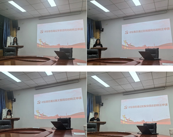 会议首先由康博远同志清点、报告应出席党员人数和实际到会人数、宣布本次会议的主要内容,并介绍会议流程。会议首先由李茹洁等四名同志宣读《转正申请书》,汇报自己在预备期间的表现,肯定成绩,找出缺点和不足,表明自己的态度和决心,必要时向党组织说明有关问题和情况。随后,由两名入党介绍人介绍了转正申清人的基本情况并就能否转正发表意见,与会同志经过充分讨论,分别对李茹洁等4位同志思想政治、学生工作表现进行了客观评价。大会一致认为4位同志基本具备了共产党员转正的条件,同时也提出了一些希望和建议。根据《中国共产党章程》相关规定,支部大会正式党员采用无记名投票的方式进行表决,一致通过同意李茹洁等4位同志按期转为正式党员,并形成会议决议上报学院党委。