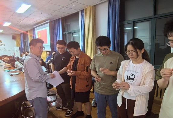 康博远为五名预备党员发放党员徽章(摄影 孙炜鹏)