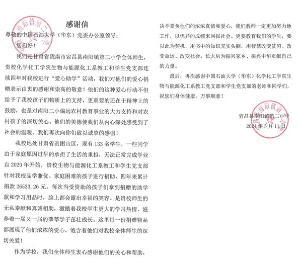 “我们是甘肃省陇南市宕昌县南阳镇第二小学全体师生,感谢贵校yl6809永利YL集团生物与能源化工系教工和学生党支部连续四年的爱心助学活动!”近日,一封跨越一千四百三十公里的感谢信,让我校能化系的师生激动不已。这背后是一段四年爱心接力、公益助学“开花结果”的感人故事。