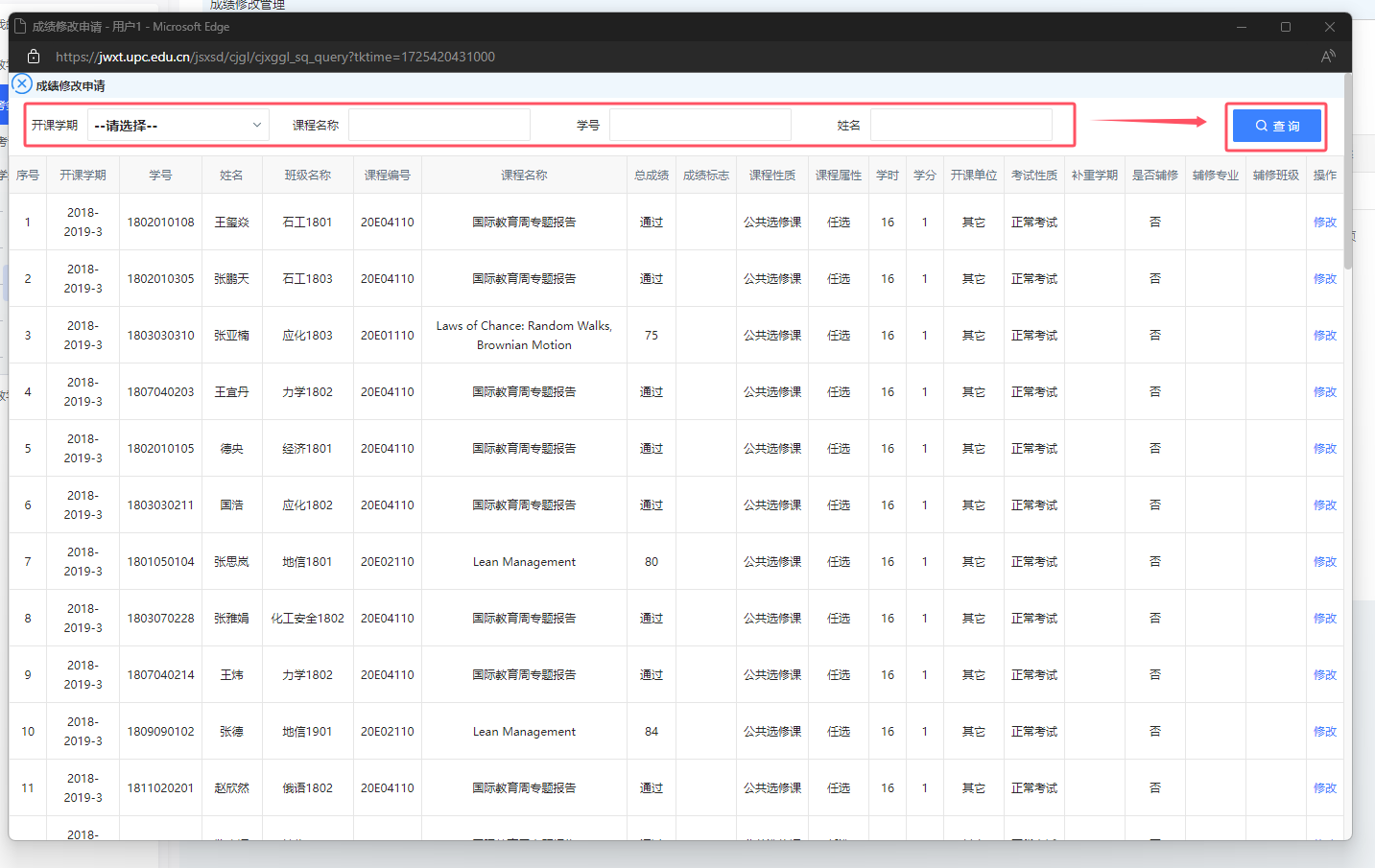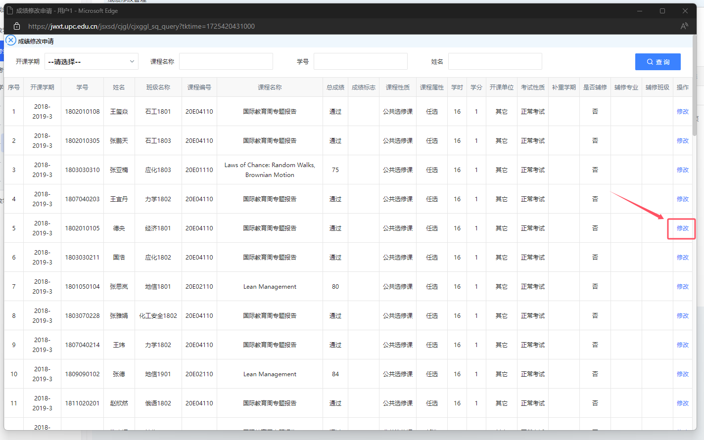 3)找到需要更正的成绩,点击最后一列的[修改]。