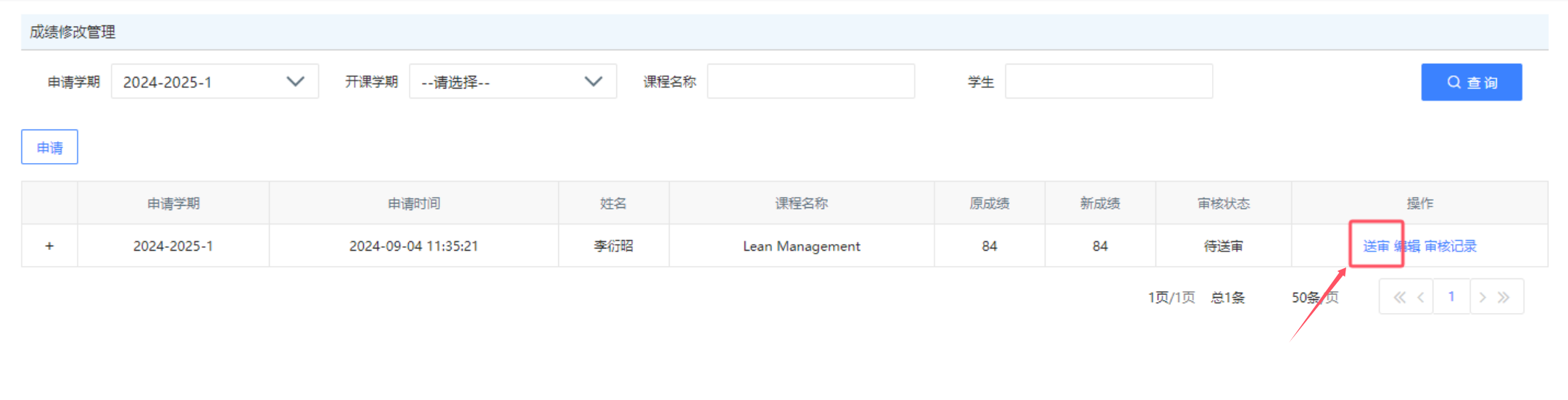 5)在查询界面点击[送审],完成成绩更正申请提交。