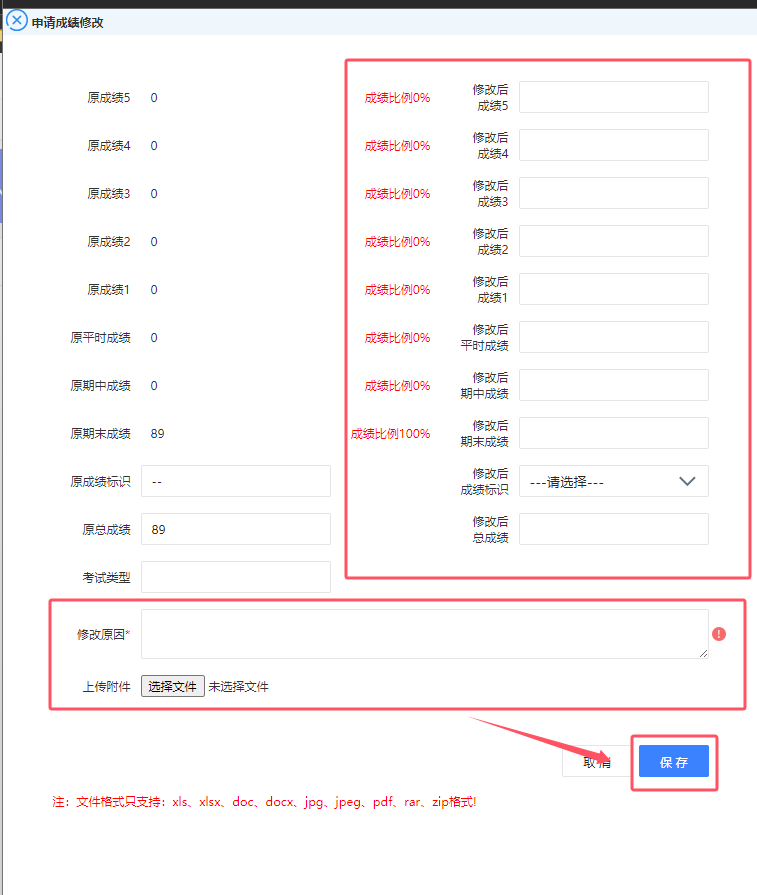 4)录入更正后的成绩(包括细分项目及标识),填写详细的修改原因,并上传佐证材料,确认无误后点击[保存]。
