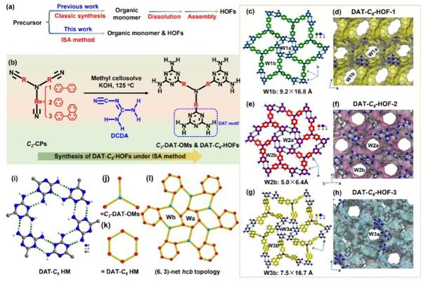针对上述问题,曾景斌教授团队提出了“单体合成-框架组装”(ISA)一体化策略,用于系统构建二氨基三嗪基(DAT)HOFs,即合成构建DAT-HOFs所用的OMs,同时可以实现HOFs的组装过程,其可以最大程度保留原始氢键状态有效避免由于OMs溶解和再结晶过程引起HOFs的拓扑结构差异。在ISA策略下,曾景斌教授团队成功地构建了一系列基于三苯胺具有(6, 3)-c连接hcb拓扑的DAT-C6-HOFs(-1,-2,-3)。研究通过可控地调节C3对称氰基前体(C3-CPs),可以实现DAT-C6-HOFs孔径和环境的定制调控;通过X-射线单晶结构解析以及密度泛函(DFT)理论计算,明确了DAT-C6-HOFs成功组装的必要条件是其氰基合成前体的平面型C3对称分子构型以及双氰胺合成前体形成的氢键六聚体团簇诱导模板的共同作用,并详细探究了DAT-C6-HOFs(-1,-2,-3)对PFOA的检测性能,分别从结构和电子转移层面揭示了检测机制。该研究不仅为定向设计和合成同拓扑结构的HOFs提供了可行的策略,使得系统研究HOFs结构与性质之间的构效关系成为可能,也为其他分子晶体的结构调控提供了新的思路。