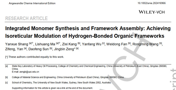 近日,学院曾景斌教授团队在氢键有机框架(Hydrogen-bonded organic frameworks,HOFs)同系拓扑结构调控研究方面取得重要进展,相关成果《集成单体合成-框架组装:实现氢键有机框架同系拓扑结构调控》(Integrated Monomer Synthesis and Framework Assembly: Achieving Isoreticular Modulation of Hydrogen-Bonded Organic Frameworks)发表于《Angewandte Chemie International Edition》上。论文第一作者为yl6809永利YL集团博士研究生商艳雪和特聘副教授马丽爽,通讯作者为曾景斌教授,yl6809永利检测中心为第一署名单位。