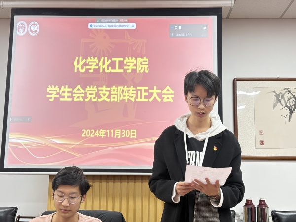 2024年11月30日,化院学生会党支部于工科A座121顺利举行预备党员转正大会。此次会议旨在审议马硕、李煜龙、程闯等9名预备党员的转正申请。会议由党支部书记吴雪莹主持,学生会党支部全体同志共同参会。