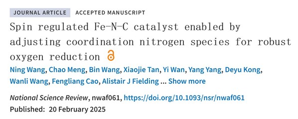 近日,我院胡涵教授联合新能源学院吴明铂教授、上海光源李丽娜研究员、利物浦约翰摩尔斯大学Alistair J Fielding博士等在国际顶级期刊《National Science Review》上发表题为“Spin regulated Fe-N-C catalyst enabled by adjusting coordination nitrogn species for robust oxygen reduction”的研究论文。论文第一作者为我院博士研究生王宁,通讯作者为胡涵教授。该研究工作得到国家自然科学基金、山东省创新发展联合基金等项目支持。