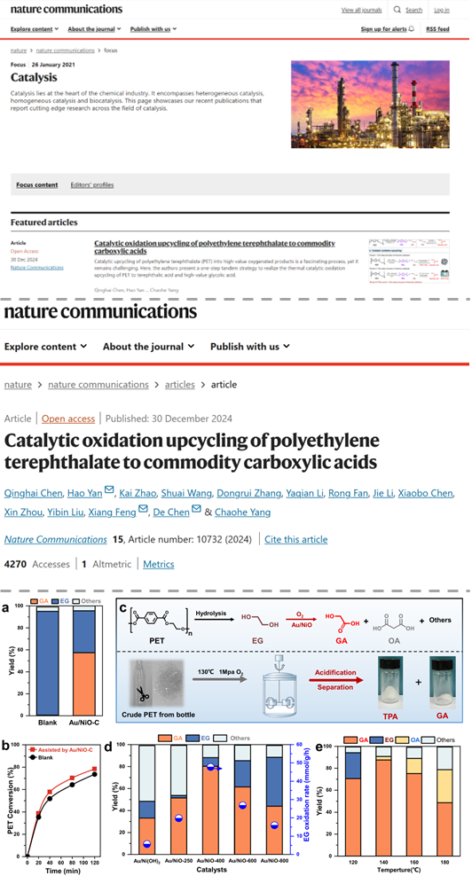 聚对苯二甲酸乙二醇酯(PET)作为全球消费量最大的聚酯材料,广泛应用于包装、薄膜等领域,每年有大量废弃PET被遗弃在自然界中,稳定的结构导致在自然环境中难以降解,造成严重的白色污染。在“双碳”发展理念和循环经济的发展格局下,推动废塑料的高值化转化既可以实现废塑料再生利用,减少化石能源使用,又可以降低二氧化碳排放,保护生态环境安全。针对废弃PET中丰富的含氧单体,将其中乙二醇(EG)转化为高价值的乙醇酸(GA)无疑是一种具有前景的方法。研究团队首次提出热催化一步解聚氧化策略,将聚酯直接转化为商品级乙醇酸晶体。废弃PET在Au/NiO的催化下实现解聚和氧化串联反应,再经过分离和纯化操作,最终得到收率为77.51%的乙醇酸晶体,并通过在载体上引入氧空位,调控催化剂对底物的吸附,从而减弱氧化过程中对苯二甲酸(TPA)的抑制效应,加快乙二醇到乙醇酸的反应速率,实现PET到乙醇酸的高效转化。对比传统的碱性水解,该工艺可获得更高的经济收益(1500$/ton)及产生更少的二氧化碳排放(减少2.25kgCO2-eq/kg PET)。同时将该策略应用于其它聚酯类塑料回收,均获得较高乙醇酸收率(>80%),证明该策略具备较大的工业化应用潜力。相关成果以“Catalytic Oxidation Upcycling of Polyethylene Terephthalate to Commodity Carboxylic Acids”为题发表在NatureCommunications上,并被主编遴选为专题文章(近期发表在催化领域上最好的50篇论文),yl6809永利检测中心为第一署名单位。