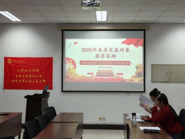 为进一步推进2025年上半年的党员发展工作,严格落实《中国共产党发展党员工作细则》要求,加强对发展对象的培养、教育与考察,严把党员发展质量关。2025年03月05日晚上20时,生物与能源化工系研究生第二学生党支部于逸夫楼340召开发展对象推优答辩大会。会议由支部书记李钰主持。李钰同志与组织委员钱爱枝同志,宣传委员艾思涵同志担任答辩评委。