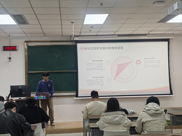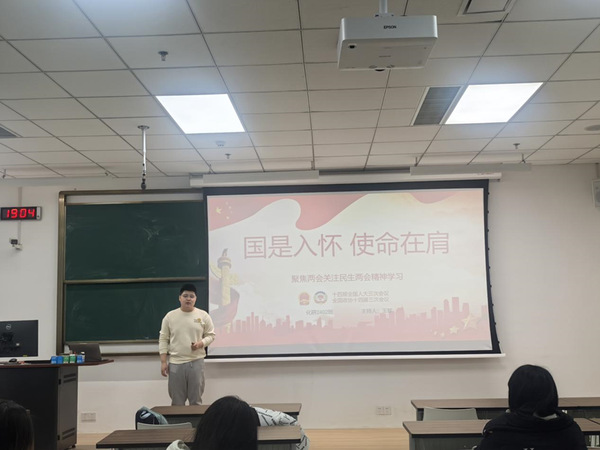 活动伊始,班长王黎同学围绕提炼出的两会热点话题进行了专题总结。他重点解读了新质生产力、就业创业、生态环境以及人才建设等与青年学生密切相关的内容,并结合实际案例,为同学们提供了丰富的知识背景和深入的思考角度。团支书苏振宇同学强调,作为新时代青年,应主动关注国家发展大局,将个人成长与国家需求紧密结合。