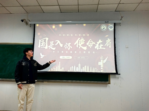 班会伊始,班长牛甲力通过播放2025年两会开幕式片段,直观呈现国家科技创新成果与高质量发展蓝图。他结合“新质生产力”“科技自立自强”等关键词,强调研究生在突破关键技术、服务国家战略中的使命担当。