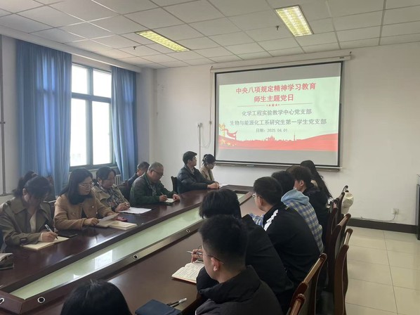 为深入贯彻落实中央八项规定精神学习教育,进一步学习习近平总书记关于加强党的作风建设重要论述,4月1日上午,化学工程实验教学中心党支部联合生物与能源化工系研究生第一学生党支部在工科A325召开“深化中央八项规定精神学习,筑牢廉洁自律防线”主题党日活动,活动由化学工程实验教学中心党支部书记张淑霞同志主持,两支部师生党员参加。