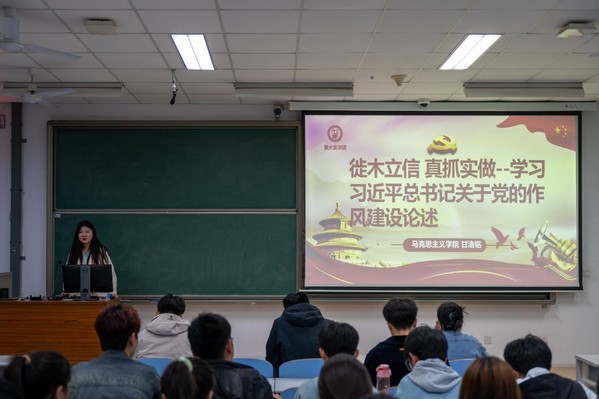 活动伊始,马克思主义学院学生“星火”宣讲团学生讲师甘洛铭以“徙木立信真抓实做——学习习近平总书记关于党的作风建设论述”为主题展开宣讲。甘洛铭指出,习近平总书记高度重视党的作风建设,强调作风建设是党的建设的永恒主题,党的作风关系党的形象,关系人心向背,关系党的生死存亡。她还着重强调,作为入党积极分子,要深刻领会党的作风建设的重要性,在日常学习和生活中以身作则,坚决抵制形式主义、官僚主义,以实际行动践行党的宗旨。甘洛铭富有感染力的宣讲,引发了在场同志的强烈共鸣,赢得了阵阵掌声。