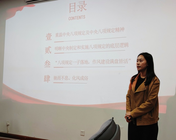 宣讲结束后,党支部书记钱立坤对宣讲内容进行总结。钱立坤强调,全体预备党员同志须进一步加强学习理论知识,首要解决党支部纯洁性问题,以高标准严格要求自身,发挥模范带头作用。随后,支部正式党员李文轩结合自身经历就宣讲内容发表见解。她指出,作为新时代的青年学生,需深刻领会八项规定精神内涵,明确核心要义树立正确的权力观、利益观与群众观,并落实到方方面面的实际行动中去。支部正式党员梅国栋指出,每一名预备党员同志须时刻牢记入党初心,认真践行基本义务,明确自身问题,并及时进行反思与总结。