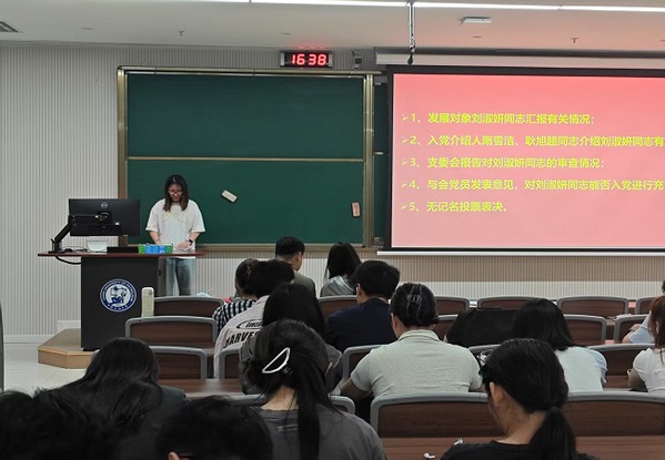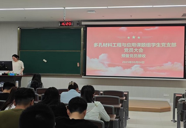 2025年6月4日下午,多孔材料工程与应用课题组学生党支部在古镇口校区综合楼地下006召开了讨论接收预备党员支部大会。会议由支部书记谢雅璇主持,应到会有表决权党员42人,实到有表决权党员36名,超过本支部有表决权党员半数以上,符合规定人数,可以开会。