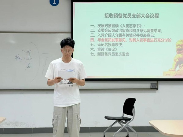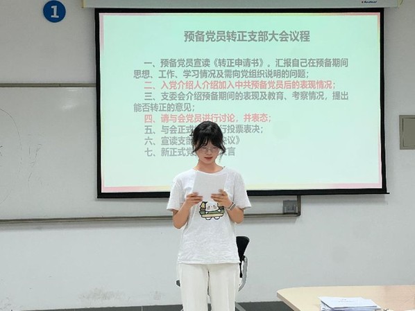 2025年6月6日晚,本科生第四学生党支部在综合楼A502召开预备党员接收与转正大会,会议由党支部书记张亦弛主持。
