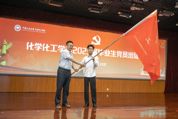 张永宁为2025届毕业生党员青年先锋队授旗。旗面上“化育初心 工致报国”八个大字熠熠生辉,这既是学校学院对青年学生的期许和鼓励,也是对他们的鞭策与激励。希望石大化院人能在新的院校或岗位上学先锋、做先锋,开拓奋进、再谱新篇。