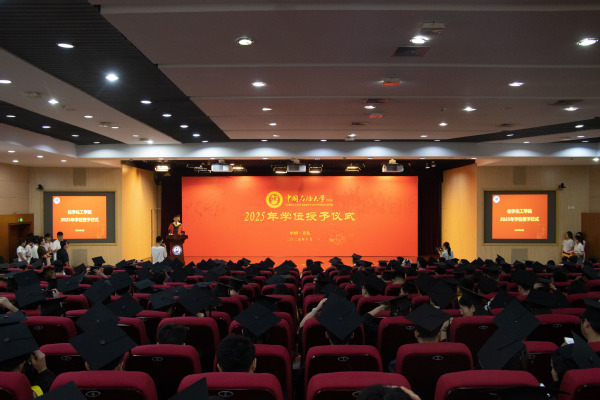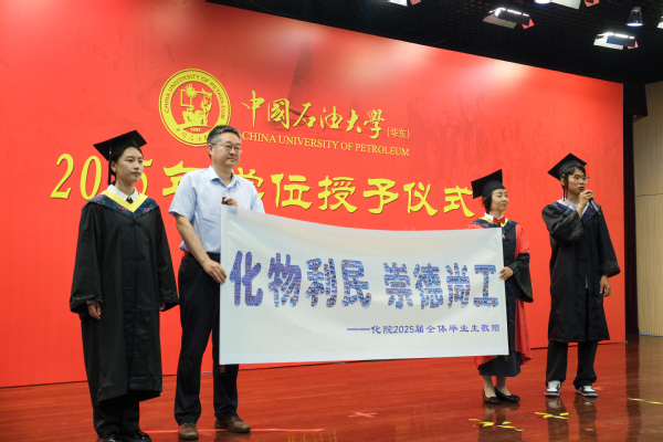 2025届学院共有438人获得学士学位,325人获得硕士学位,45人获得博士学位。在欢快的进行曲中,刘欣梅、刘东为获得博士、硕士学位的毕业生颁发学位证书。刘欣梅、刘东、刘义、曾景斌、黄方、刘芳分别为化工、应化、化安、化学、能化、环境各专业的本科毕业生颁发学位证书。
