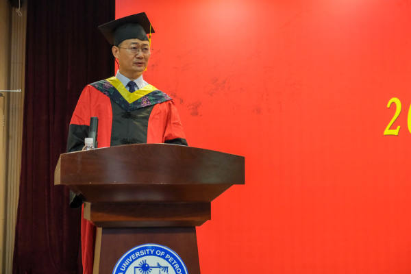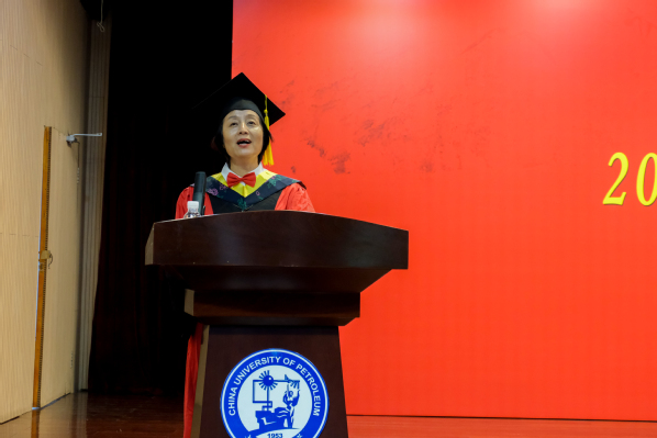 在全体起立奏唱国歌后,学院院长刘欣梅致辞,她代表学院向全体毕业生表示热烈祝贺,并向辛勤付出的老师、家长、亲友表达衷心的感谢和崇高的敬意。面对即将启程的毕业生,刘欣梅与毕业生们深情话别,为即将远行的学子送上三点祝福与期许:一是要继续追逐青春理想,将人生理想嵌入祖国发展蓝图,于科研攻关前沿、能源建设一线、社会服务基层淬炼成钢,在祖国最需要的地方书写青春答卷;二是要继续释放青春活力,要始终保持对世界的好奇心,保持初生牛犊的锐气,保持超越自我的勇气,继续学习、继续探索、继续突破,用青春的能动力和创造力成就自我;三是要继续坚持青春奋斗,将奋斗作为实现人生理想的催化剂,不断提高与时代发展和事业要求相适应的素质和能力,肩负起时代赋予的历史使命,书写无悔于时代的青春篇章。