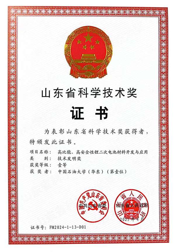 6月27日,2024年度山东省科学技术奖励大会在济南隆重举行。大会宣读了《中共山东省委山东省人民政府关于2024年度山东省科学技术奖励的决定》,对全省优秀科技成果进行表彰。我院新型碳材料研究室李忠涛教授团队主持完成的“高比能、高安全性锂二次电池材料开发与应用”项目荣获山东省技术发明一等奖,这是我校本年度唯一一项一等奖的科研成果。