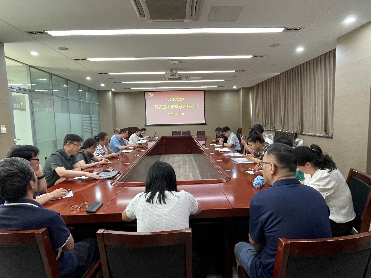为深入学习贯彻习近平新时代中国特色社会主义思想,扎实推进党史学习教育常态化长效化,2025年6月30日上午,化学系党支部召开党员基本培训专题交流研讨会,交流研讨中央党校副校长谢春涛教授所作的《中国共产党与中华民族伟大复兴》专题辅导报告。会议由支部书记王创业主持,胡涵院长莅临研讨会进行指导,全体化学系教职工党员参加。