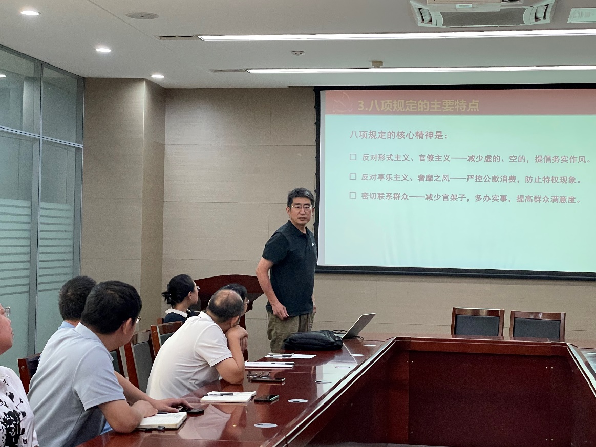 随后,支部书记王创业给党员们讲“学习落实中央八项规定精神”的主题党课,内容包括“中央八项规定”的背景意义与核心内容、为什么要落实“中央八项规定精神”,以及如何结合工作实际落实“中央八项规定精神”。他提出,作为高校教师,要以学生为中心,关注学生全面发展,以身作则,在课堂教学、师生交往中传递清正廉洁价值观,将作风建设与学科建设、人才培养相结合,持续推动党建与业务深度融合,以优良党风带动师德师风建设,为培养新时代高素质人才提供坚实保障。