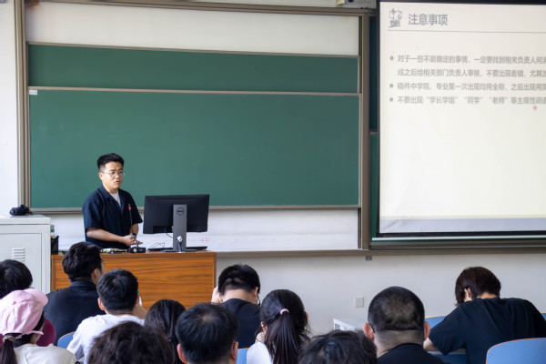启动仪式结束后,学院随即开展暑期社会实践培训。首先,辅导员钱立坤围绕宣传工作展开培训,从QQ公众号投稿到微信公众号投稿,对稿件撰写、图片拍摄等内容进行了细致讲解。随后,社会实践中心杨朝洁结合真实案例,开展安全专题培训,针对实践过程中可能遇到的突发状况,提出切实可行的应对策略,有效提升了队员的安全防范意识。最后,指导教师车桐宇对暑期社会实践进行全面解读,他结合自身经验与历年实践案例,从宏观思路到具体执行细节,与队员深入交流,为实践活动的有序推进提供了专业指导。