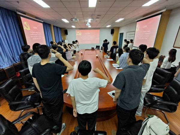 案例宣读结束,支部成员在李文轩的带领下,在入党誓词前进行宣誓,本次宣誓是对新预备党员的精神鼓舞,明确未来奋斗方向,也是对旧预备党员的自我检视,反思以往工作成果。对入党誓词的宣誓,见证着支部成员为共产主义事业奋斗终身的坚定信念。