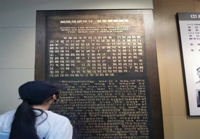 步入庄严肃穆的纪念馆园区,实践队员首先在辽沈战役革命烈士纪念塔前肃立致敬。巍峨高塔无言矗立,仿佛诉说着那段气壮山河的岁月。随后,实践队员走进展馆,在“运筹帷幄,决胜千里”展区,他们驻足凝视作战地图、往来电文及领导人珍贵手迹,深刻感受党中央在战略决战关头的雄韬伟略与非凡魄力,理解了辽沈战役作为解放战争转折点的关键意义。
