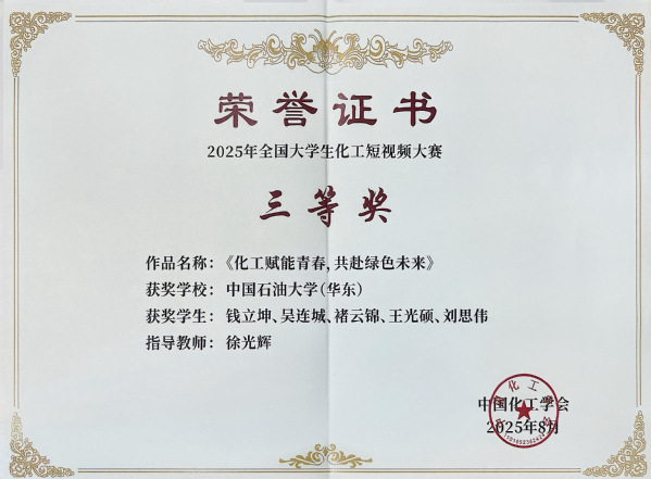 | 化工赋能青春,共赴绿色未来 | 钱立坤、吴连城、禇云锦、王光硕、刘思伟 | 三等奖 |