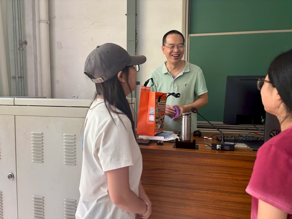 9月10日上午,待老师们上完课,班委代表提着精致礼盒等候在教室门口。盒内是定制的低糖抹茶、芋泥蛋糕与莲蓉、五仁月饼,兼顾不同喜好;礼盒系着淡雅丝带,挂着同学们亲笔书写的贺卡——有人画上可爱的卡通图案,有人写下“谢谢您的耐心指导”,每一张都藏着巧思。老师们接过礼盒,看到卡片上的暖心话语,纷纷露出惊喜笑容,一位老师打趣道:“这节课的‘课后惊喜’,比做题还让人开心!”