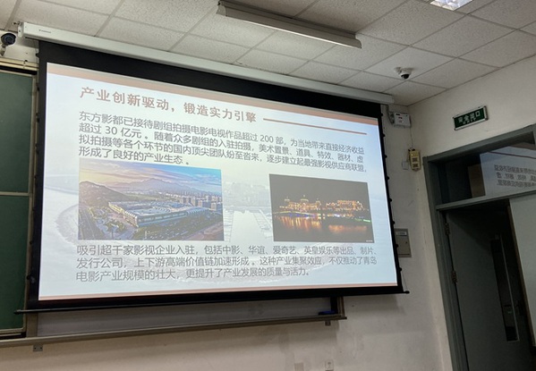 宣讲现场,青马七班宣讲团成员以“行走的博物馆讲解员”身份,分板块展开分享。在“光影溯源”环节,成员细致讲解中国电影从萌芽到壮大的发展历程,尤其聚焦青岛在电影史上的独特地位——从民国时期成为《渔光曲》等经典影片的外景地,到如今东方影都承载国际大片拍摄,用“老照片+新影像”的对比,让学子直观感受青岛电影产业的变迁。